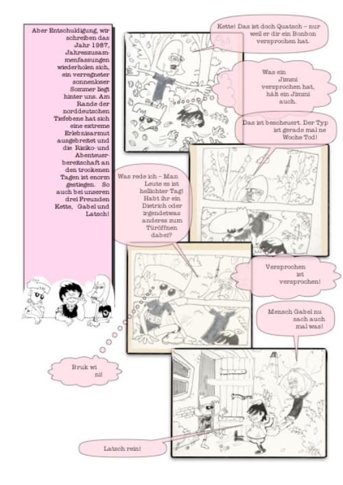 Hinter unseren Jungs liegen sechs verregnete, erlebnisarme Ferienwochen! Die Schule hat begonnen und es soll endlich wieder etwas passieren. Kette fällt eine alte Schuld ein. Jimmy Jach Jach Jach dorfbekannter Bauer und Spitzenschwimmer ist gestorben, aber hatte Kette einen Bonbon als Lohn versprochen. Ergo brechen die drei Helden über den Hühnerstall in sein Haus ein und bringen einige Sachen an sich, die ihnen ganz neue Einblicke in die Tellingstedter Vergangenheit gewähren. Aber lest selbst... (Entstanden im Jahr 1995 als „spinoff“ von Digging Deeper - reprint im Arno Schmiidt Jubiläumsjahr und 100sten Geburtstag - 2014)